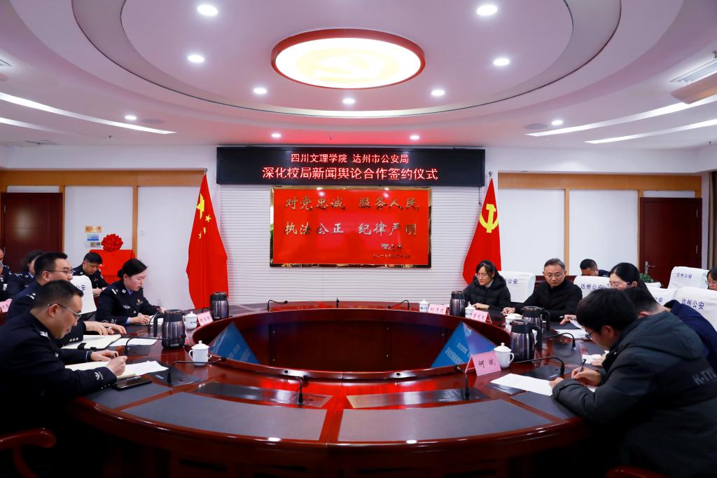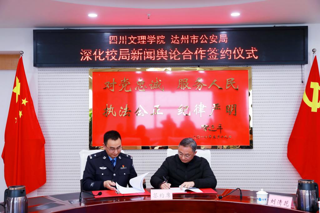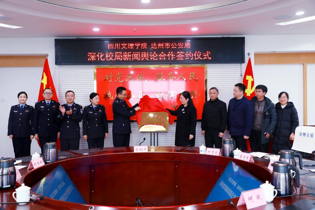为进一步落实《ac米兰官网中文网站-达州市公安局战略合作框架协议》的相关精神,促进产学研协同创新,12月14日下午,学院与达州市公安局在公安局党委会议室举行深化校局新闻舆论合作签约仪式。副校长程碧英、达州市公安局党委委员、政治部主任贾人全等出席签约仪式。