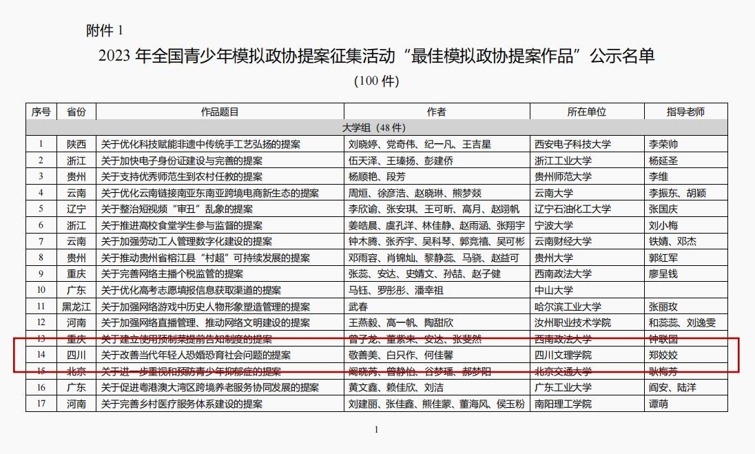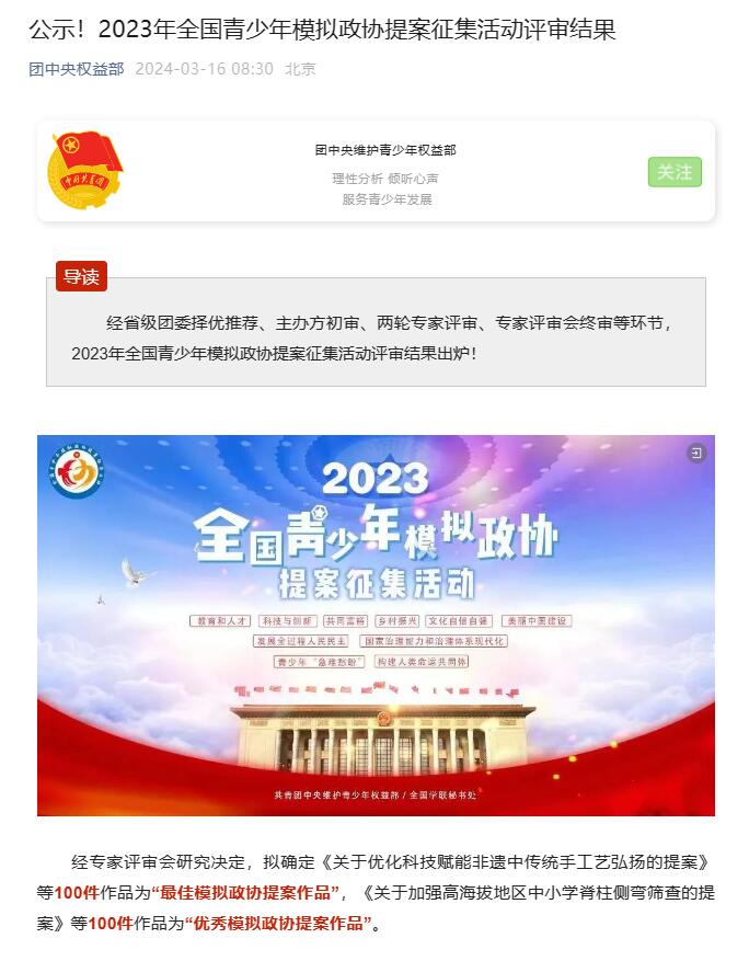 近日,团中央权益部公示了2023年全国青少年模拟政协提案征集活动评审结果,由ac米兰敬善美、白只作、何佳馨同学组队申报,郑姣姣老师指导撰写的《关于改善当代年轻人恐婚恐育社会问题的提案》荣获2023年全国青少年模拟政协提案征集活动“最佳模拟政协提案作品”。