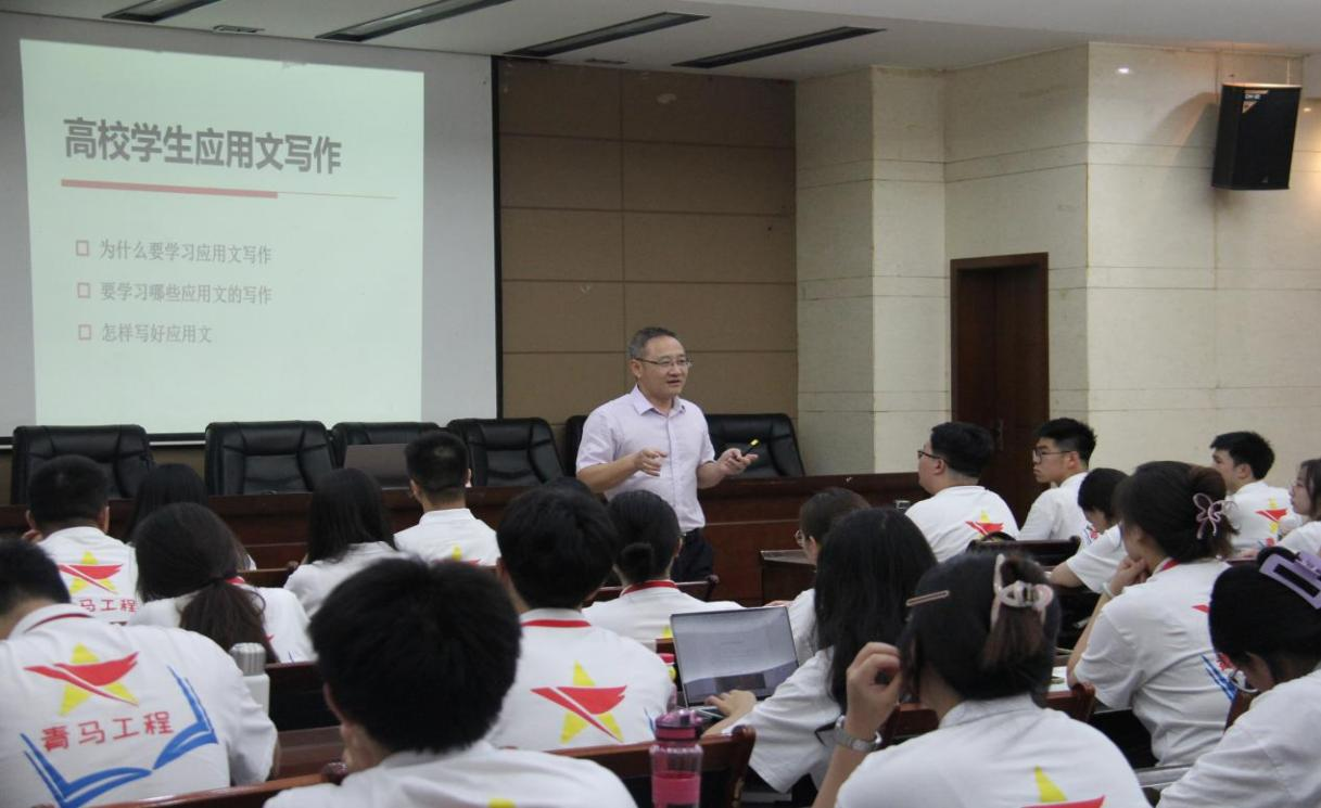 四川文轩职业学院党委书记余文盛教授作“高校学生应用文写作”专题讲座,就“为什么学习应用文写作、要学习哪些应用文写作、怎样写好应用文”等问题进行讲授,为学生们详细阐述了应用文写作的重要性、特点以及写作技巧。