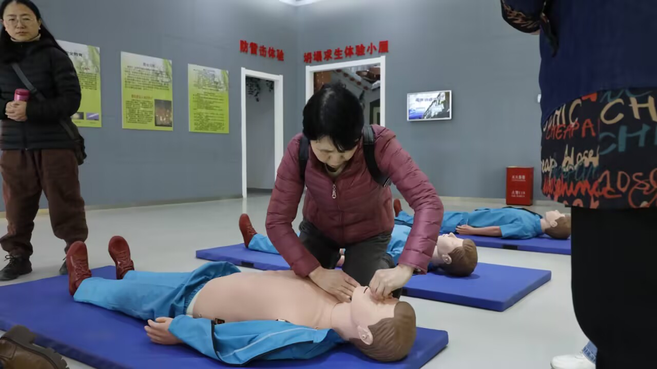 活动中,生命教育体验馆的教官介绍了地震、创伤包扎求助、电梯安全、防雷击、防踩踏、防坍蹋等相关安全知识和处置方法。讲解并示范了心肺复苏的操作步骤、按压手法、注意事项以及除颤设备AED的正确使用方法。