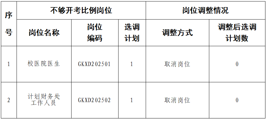 因选调岗位有效报考人数与选调名额之比未达到公告规定的笔试开考比例,取消以下2个岗位,共2个选调名额: