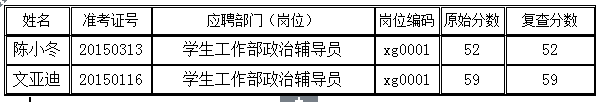 ac米兰2015年5月公开招聘工作人员考试笔试总成绩公示后,至2015年6月9日11:30,共收到2名考生要求查分的申请。在学校纪委、监审处监督下,公招工作领导小组办公室工作人员组成联合查分小组核查,现将笔试总成绩查分结果公示如下: