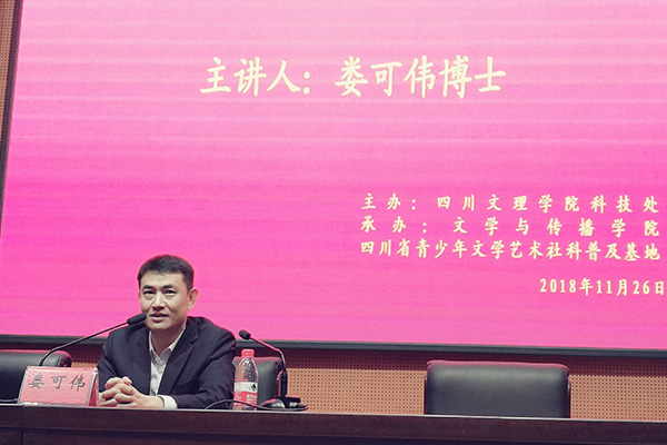 11月26日下午,中国工商银行驻川定点扶贫组组长、中共南江县委副书记、中国传媒大学博士娄可伟应文学与传播学院和四川省青少年文学艺术社科普及基地邀请,莅临学校作“融媒体语境下的播音主持应对”学术报告。副校长李壮成教授为娄可伟博士颁发客座教授聘书。