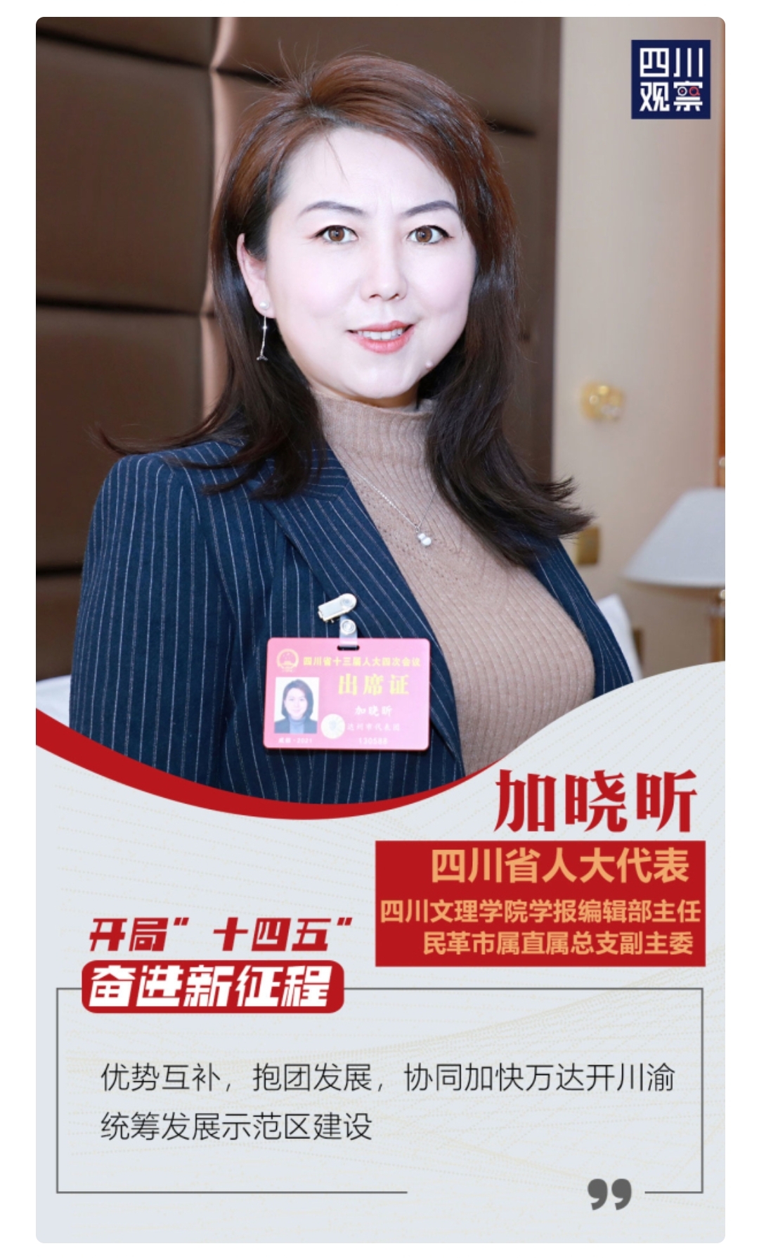 1月30日上午,四川省第十三届人民代表大会第四次会议在成都开幕。来自全省各地、各条战线的省人大代表齐聚一堂,依法履行宪法法律赋予的神圣职责,共商全面建设社会主义现代化四川大计。会议期间,四川省人大代表、ac米兰学报编辑部主任、民革市属直属总支副主委加晓昕教授接受了《四川观察》的采访,在提交的《关于支持建设“大巴山·大三峡”旅游环线的建议》中,深刻论证了协同创建万达开川渝统筹发展示范区,优势互补,抱团发展的理念。建议省委政府要加强资金、项目、土地等方面的支持力度,加快川渝城市一体化发展,省政府及省旅游局、省交通运输厅等省级有关部门支持达州推进“大巴山·大三峡”文化旅游环线建设,将相关重点项目纳入全省交通发展规划,并重点支持巴山大峡谷创5A级景区工作和八台山-龙潭河-巴山大峡谷旅游通道建设。