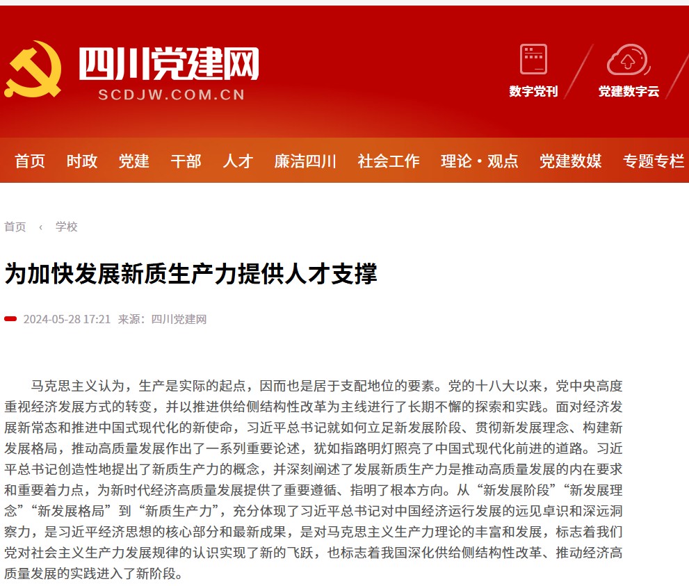 三是创新人才培养模式,保障新质生产力发展的人才供给。习近平总书记强调,要按照发展新质生产力要求,畅通教育、科技、人才的良性循环。要根据科技发展新趋势,优化高等学校学科设置、人才培养模式,为发展新质生产力、推动高质量发展培养急需人才。高校必须坚守为党育人、为国育才的初心使命,落实好立德树人根本任务,在党和国家事业全局中思考和把握育人的政治使命。对于应用型高校来说,要紧紧围绕加快形成新质生产力的新标准和新要求,创建产教融合的复合型人才培养新方式,加快培养储备与战略性新兴产业、未来产业发展相适应的复合型专业人才和急需人才。ac米兰官网中文网站坚持把校区建在园区上,通过与川东北地区重点企业、行业共建实习实训基地、产学研合作基地、现代产业学院,特别是加强多主体共建现代产业学院,打造融人才培养、科学研究、技术创新、企业服务、学生创业等功能于一体的产教融合育人实体,大力培养适应地方新质生产力发展需要的高素质应用型、复合型人才。实施新时代红色文化育人工程,着力从红色文化中汲取文化育人的思想源泉和精神营养,切实提升立德树人成效,不断强化人才成长的政治要求和价值导向。