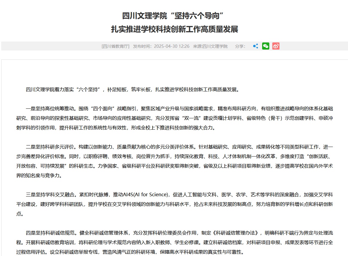 三是坚持学科交叉融合。紧扣时代脉搏,推动AI4S(AI for Science),促进人工智能与文科、医学、农学、艺术等学科的深度融合,加强交叉学科平台建设,建好跨学科科研团队,提升学校在交叉学科领域的创新能力与科研水平,抢占未来科技发展的制高点,努力培育新的学科增长点和科研创新点。