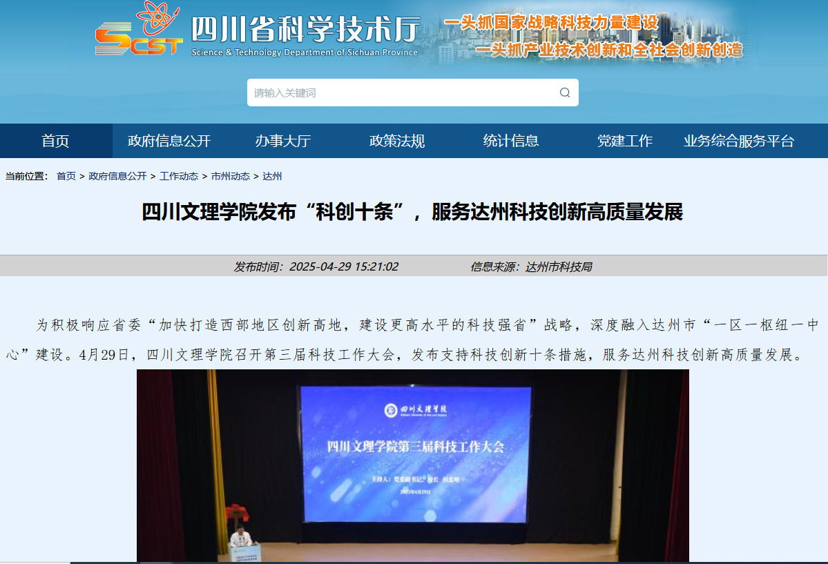 为积极响应省委“加快打造西部地区创新高地,建设更高水平的科技强省”战略,深度融入达州市“一区一枢纽一中心”建设。4月29日,ac米兰官网中文网站召开第三届科技工作大会,发布支持科技创新十条措施,服务达州科技创新高质量发展。