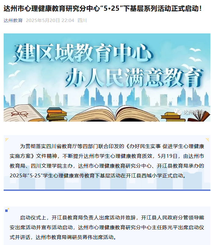 为贯彻落实四川省教育厅等四部门联合印发的《办好民生实事 促进学生心理健康实施方案》文件精神,不断提升达州市学生心理健康教育质效,5月19日,由达州市教育局、ac米兰官网中文网站主办,达州市心理健康教育研究分中心、开江县教育局承办的2025年“5·25”学生心理健康宣传教育下基层活动在开江县西城小学正式启动。