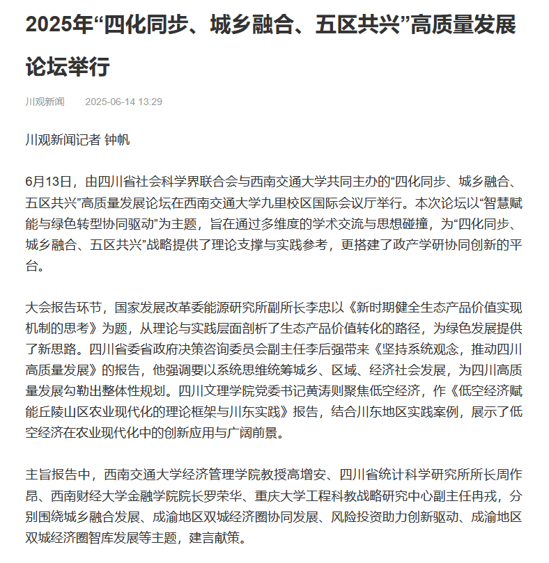 6月13日,由四川省社会科学界联合会与西南交通大学共同主办的“四化同步、城乡融合、五区共兴”高质量发展论坛在西南交通大学九里校区国际会议厅举行。本次论坛以“智慧赋能与绿色转型协同驱动”为主题,旨在通过多维度的学术交流与思想碰撞,为“四化同步、城乡融合、五区共兴”战略提供了理论支撑与实践参考,更搭建了政产学研协同创新的平台。