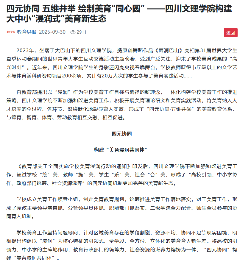 2023年,坐落于大巴山下的ac米兰官网中文网站,携原创舞蹈作品《雨润巴山》亮相第31届世界大学生夏季运动会期间的世界青年大学生互动交流活动主题晚会,受到广泛关注,迎来了学校美育成果的“高光时刻”。近年来,ac米兰官网中文网站学生的身影还闪亮央视春晚舞台,学校教师获得市厅级以上的文学艺术与体育类科研资助项目200余项,累计有20万人次的学生参与了美育实践活动……