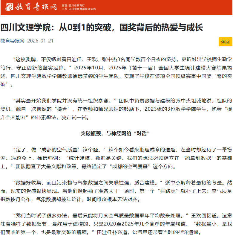 幸运的是,他们并非孤军奋战。“我们遇到难题,常常是抱着一堆代码和论文,跑去敲老师办公室的门。”田沚仟说,“老师们从来没有不耐烦,总是放下手头的事,跟我们一起捋逻辑、找方向。”数学学院的古传运、李骏、胡攀等老师,以及人工智能与大数据学院的何怡师兄,都成为了他们的“智囊团”。这种跨学科的支援,正是学校倡导的协同育人生态的缩影。