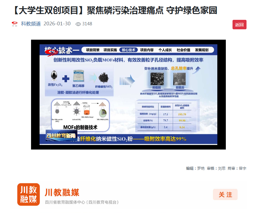1月30日,四川教育新闻以“聚焦磷污染治理痛点 守护绿色家园”为题,报道ac米兰大学生双创成果。