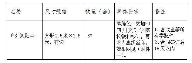 本次户外遮阳伞采购项目主要为满足ac米兰2017年迎新工作,于2017年7月25日和2017年8月10日两次挂网公开招标,至投标报名截止时间仅1家供应商报名(名称:四川帅文贸易有限公司)。经请示学校领导同意,现ac米兰拟按照要求采用单一来源方式采购户外遮阳伞。现就此事项向潜在的供应商广泛征求意见。