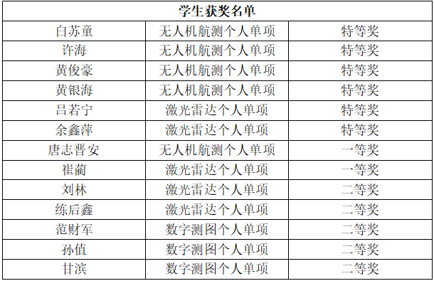 全国大学生测绘学科创新创业智能大赛由中国测绘学会教育工作委员会主办,每年举办一次是全国大学生展示测绘科技创新的最高级别赛事,大赛获奖比例仅为30%,共分三个赛项,分别为测绘技能竞赛、开发设计竞赛和科技论文竞赛,共计有来自全国300余所高校的5500余名学生参赛,参赛学校和学生人数创下了历届大赛规模之最。