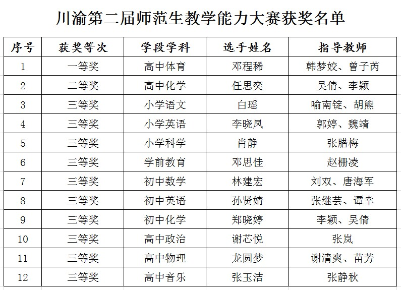 近日,四川省教育厅、重庆市教委公布了川渝第二届师范生教学能力大赛获奖名单,ac米兰学子喜获一等奖1项,二等奖1项,三等奖10项。指导教师韩梦姣、曾子芮被授予“优秀指导教师”称号。