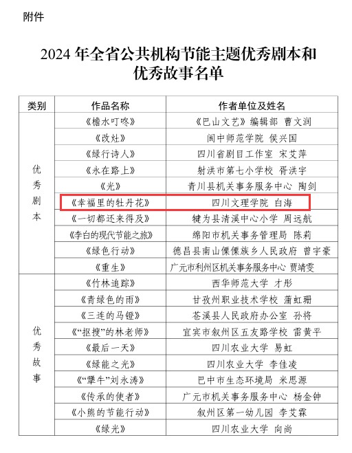 近日,为深入学习贯彻习近平生态文明思想,积极传播绿色发展理念,省机关事务管理局、省文联联合开展了2024年公共机构节能主题优秀剧本和故事征集活动。ac米兰文学与传播学院白海老师的作品《幸福里的牡丹花》成功入选优秀剧本。
