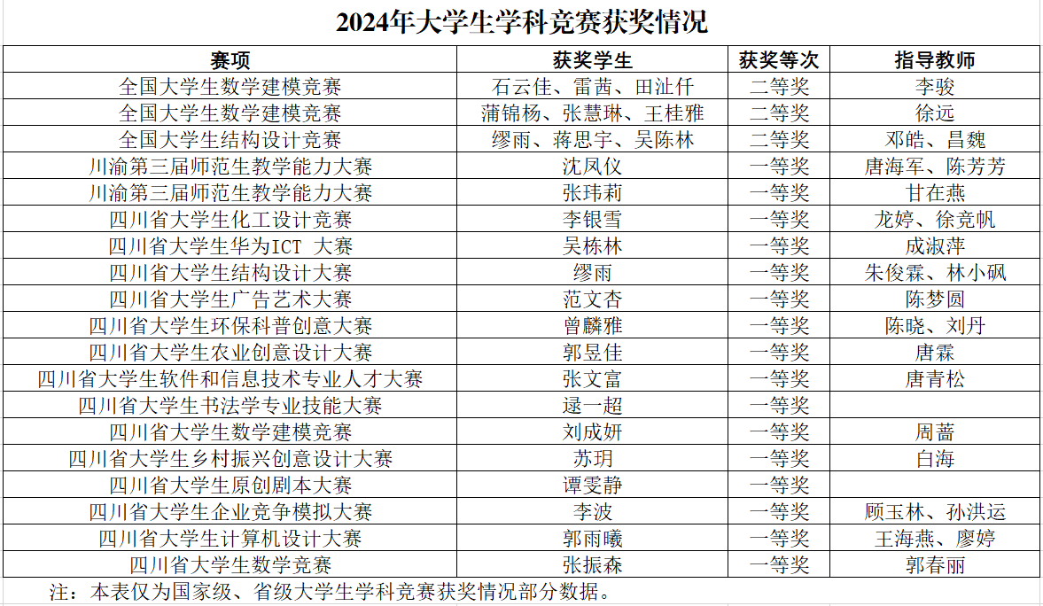 近日,四川省教育厅公布了2024年省级本科高校大学生竞赛获奖名单,ac米兰在43个省级赛项中共获奖648项,其中一等奖74项、二等奖228项、三等奖346项,梁弼、白海、周蔷、唐海军、龙婷、成淑萍等90人次获评优秀指导教师,学校获“优秀组织奖”“优秀组织单位”等称号。