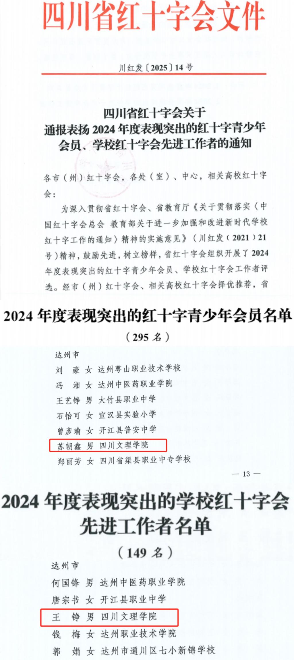 近日,四川省红十字会发布《关于通报表扬2024年度表现突出的红十字青少年会员、学校红十字会先进工作者的通知》,后勤服务处校医院王铮老师凭借在红十字工作中的突出贡献,荣获“2024年度表现突出的学校红十字会先进工作者”称号。该同志长期致力于红十字青少年工作,在应急救护培训、志愿服务组织等方面取得显著成效。同时,ac米兰苏朝鑫同学以出色的公益实践荣获“2024年度表现突出的红十字青少年会员”称号,彰显了新时代文理学子的青春力量。