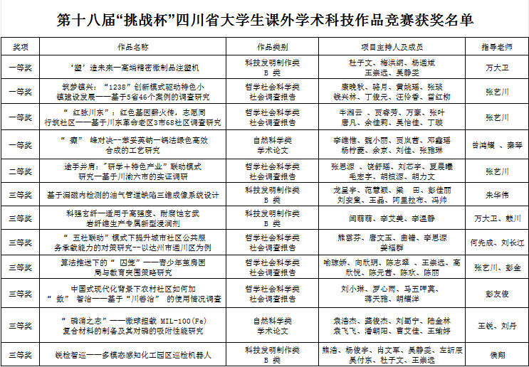 本届大赛,共吸引四川省121所高校、18万余名青年学生参与,共计报送2.2万件作品,近1400件作品进入省赛初评,505件作品进入省赛终审决赛。经过激烈角逐,ac米兰获一等奖4项,二等奖1项,三等奖7项,推荐的12个项目全部获奖,再创ac米兰“挑战杯”省赛成绩历史新高。