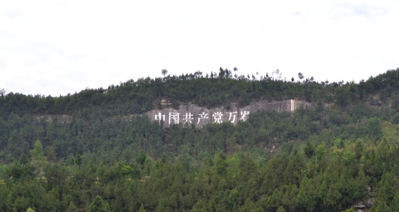 为迎接中国共产党的90岁生日,周永开出资近万元,先后雇请36名石匠用錾子一锤锤地将标语“中国共产党万岁”7个大字錾刻在该镇梁大湾村的一座山崖上。每个字高 9米,象征党的90岁生日;宽7.1米,寓意“七・一”建党节,站在远处依然能够清晰地看到这7个气势磅礴的大字。