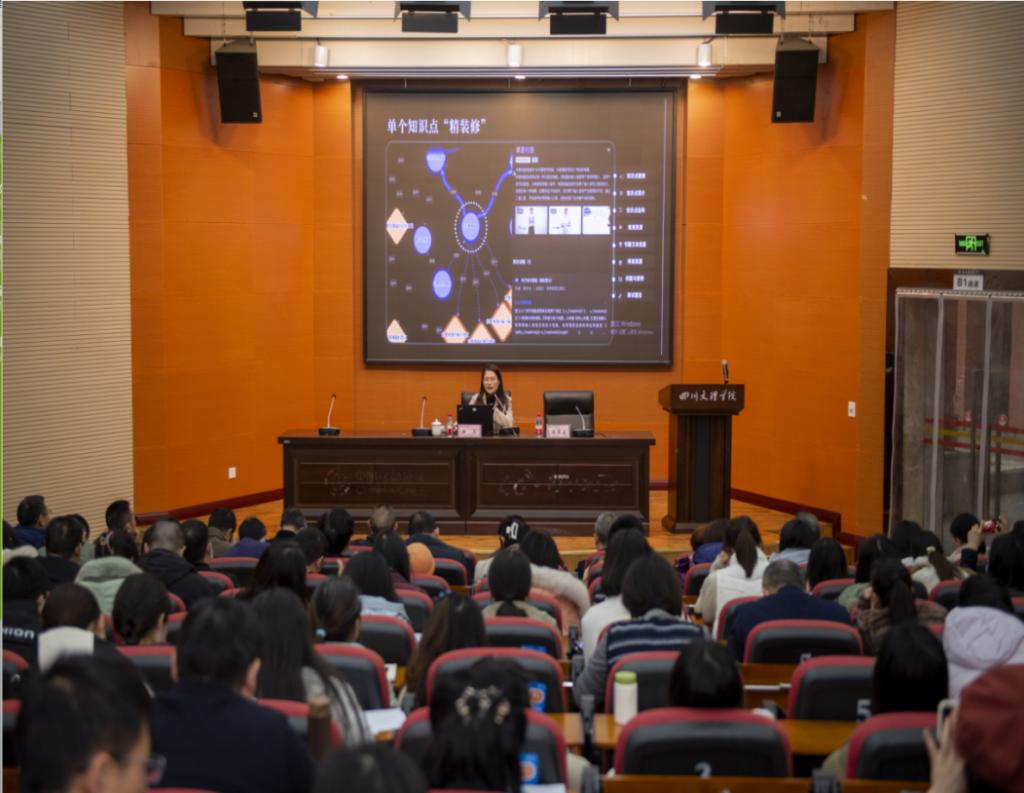 为更新教师教育教学理念,提高数字化教学能力,了解新形态教育教学方式,聚焦信息化手段赋能教学,推动课程知识图谱和优质资源建设,助力学校教学改革模式创新,12月15日,ac米兰“巴山教育教学论坛”第五讲开讲。智慧树四川课程总监徐乐应邀作“知识图谱建设与教学能力提升”专题讲座。讲座由副校长程碧英主持,全校200余位教师参加。