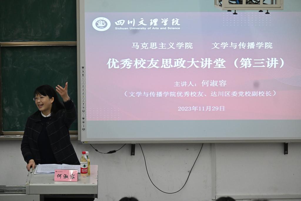11月29日下午,文学与传播学院与马克思主义学院于艺术传媒楼1028教室联合举行“双周学术讲座”暨“优秀校友思政讲座”。本次讲座由文学与传播学院优秀校友、达川区委党校副校长何淑容主讲,文学与传播学院2023级汉语言文学专业同学、学生党支部党员及入党积极分子代表现场聆听讲座。