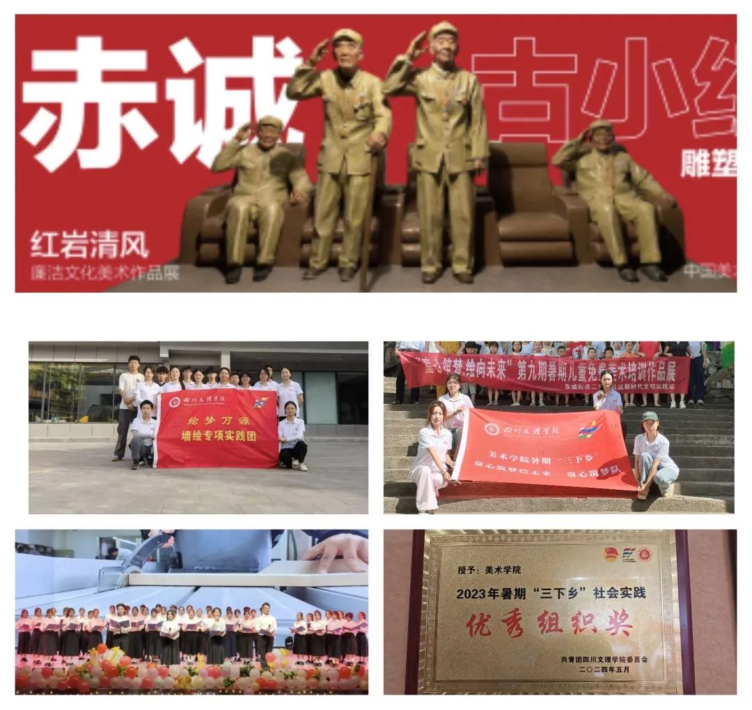 学院实行“艺术党课”特色教育,将党史、红色故事等融入活动与创作中。在青春心向党·红歌献祖国—红色歌曲合唱大赛中获二等奖。在2025年迎新晚会中,原创作品《照亮塔石的一束光》颂出美院师生聚力申硕攻坚的决心。学院古小红老师的作品《赤诚》入选重庆市“红岩清风—廉洁文化美术作品展”。学院党委充分发挥专业优势,组织开展了丰富多彩的社会服务活动。学院与万源市石塘镇杉林湾村合作,用画笔打造“墙绘景观长廊”,助力乡村文化振兴。学院党委组织2024年暑期“三下乡”—“童心筑梦·绘向未来”志愿服务活动在二马路社区开展,促进了本地文化艺术传播和发展。美术学教研党支部获“先进基层党组织”称号,学院团总支获“ac米兰官网中文网站五四红旗团总支”称号,学院荣获“2024级学生军训工作先进集体”,在第二十届“5.25大学生心理健康教育”活动中荣获“优秀组织奖”,在“清韵润文理-条例大家学《中国共产党纪律处分条例》知识竞赛中获二等奖。