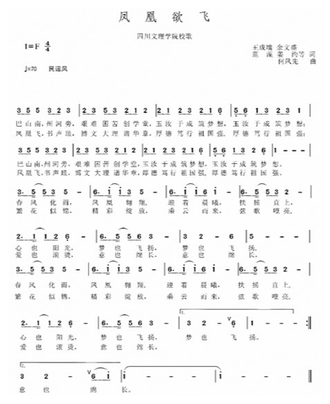 ac米兰官网中文网站校歌《凤凰欲飞》,2017年9月完成词曲创作,在四川省第八届大学生艺术节上获专业组一等奖,在第十四届中国合唱节上获银奖。凤凰在汉文化中是吉祥、勇敢、和谐、幸福的化身,是刚强勇敢、才智超群、幸福美满、生生不息的象征。《凤凰欲飞》取凤凰在浴火中重生,积蓄足够能量,意欲展翅翱翔于九天之势,喻指ac米兰官网中文网站如同凤凰翔集的梧桐林,千万学子云集于斯,师生同心同德,笃行博文大理、厚德笃行的校训,经风沐雨,为祖国富强、社会进步,呕心历胆,谱写生命华章。曲词分为两章,第一章叙写学校地理区位和办学缘起,以及源远流长的办学历史和悠久的文化底蕴;第二章表达学校的办学理念,人才培养目标和文理交融的理想人才标准;结尾部分抒写文理学子对母校的感恩之情与对灿烂如花的未来的无限憧憬。《凤凰欲飞》由王成端、余文盛、范藻、姜约等集体作词,何凤先作曲。